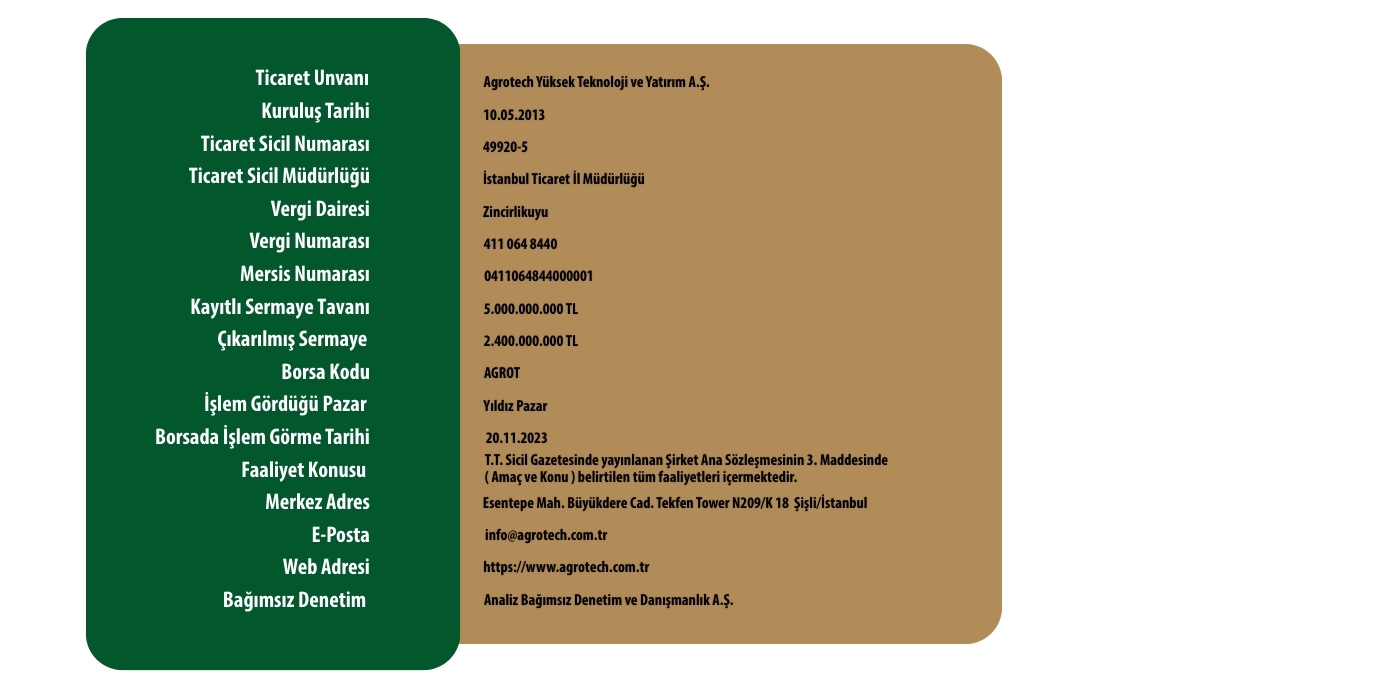 | Ticaret Unvanı | Agrotech Yüksek Teknoloji ve Yatırım A.Ş. |